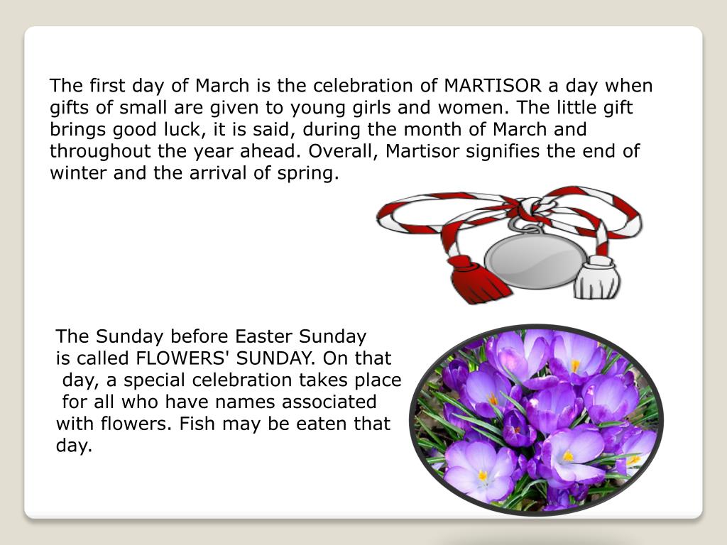 The first day of March is the celebration of MARTISOR a day when gifts of small are given to young girls and women. The little gift brings good luck, it is said, during the month of March and throughout the year ahead. Overall, Martisor signifies the end of winter and the arrival of spring. The Sunday before Easter Sunday is called FLOWERS' SUNDAY. On that day, a special celebration takes place for all who have names associated with flowers. Fish may be eaten that day.