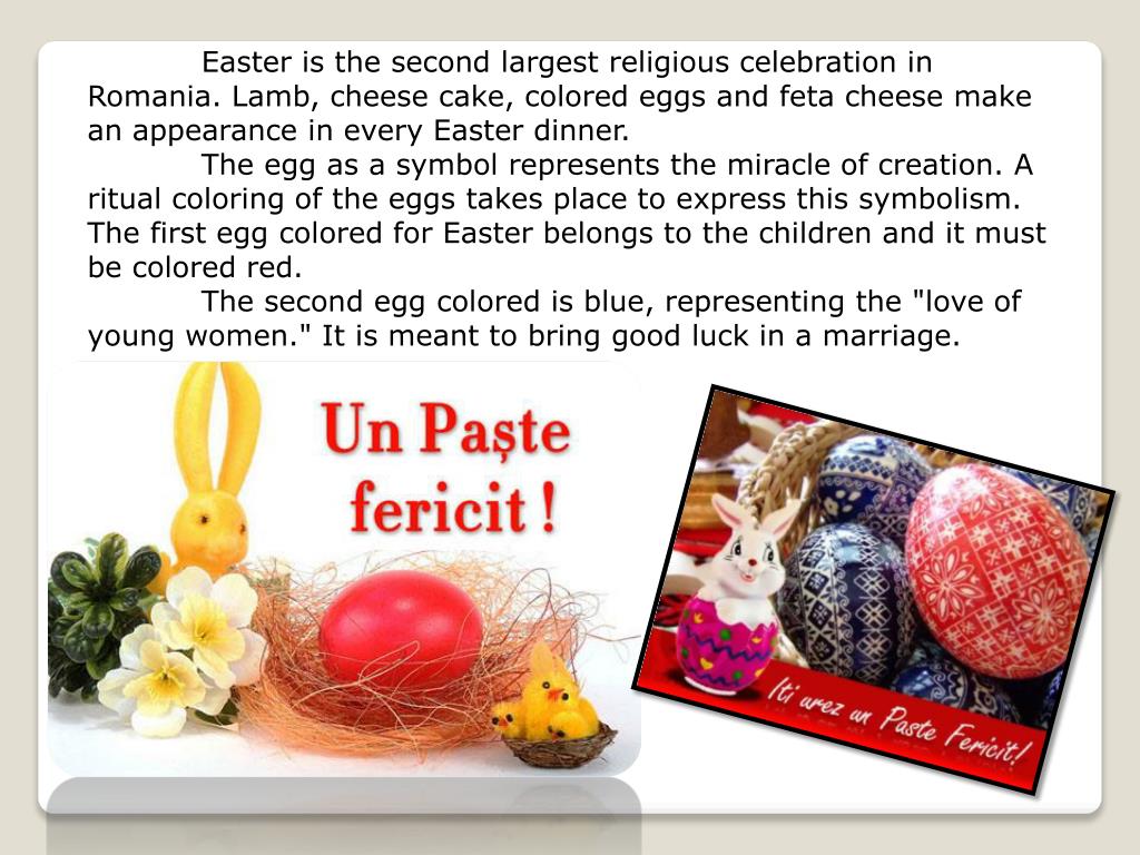 Easter is the second largest religious celebration in Romania. Lamb, cheese cake, colored eggs and feta cheese make an appearance in every Easter dinner. The egg as a symbol represents the miracle of creation. A ritual coloring of the eggs takes place to express this symbolism. The first egg colored for Easter belongs to the children and it must be colored red. The second egg colored is blue, representing the "love of young women." It is meant to bring good luck in a marriage.