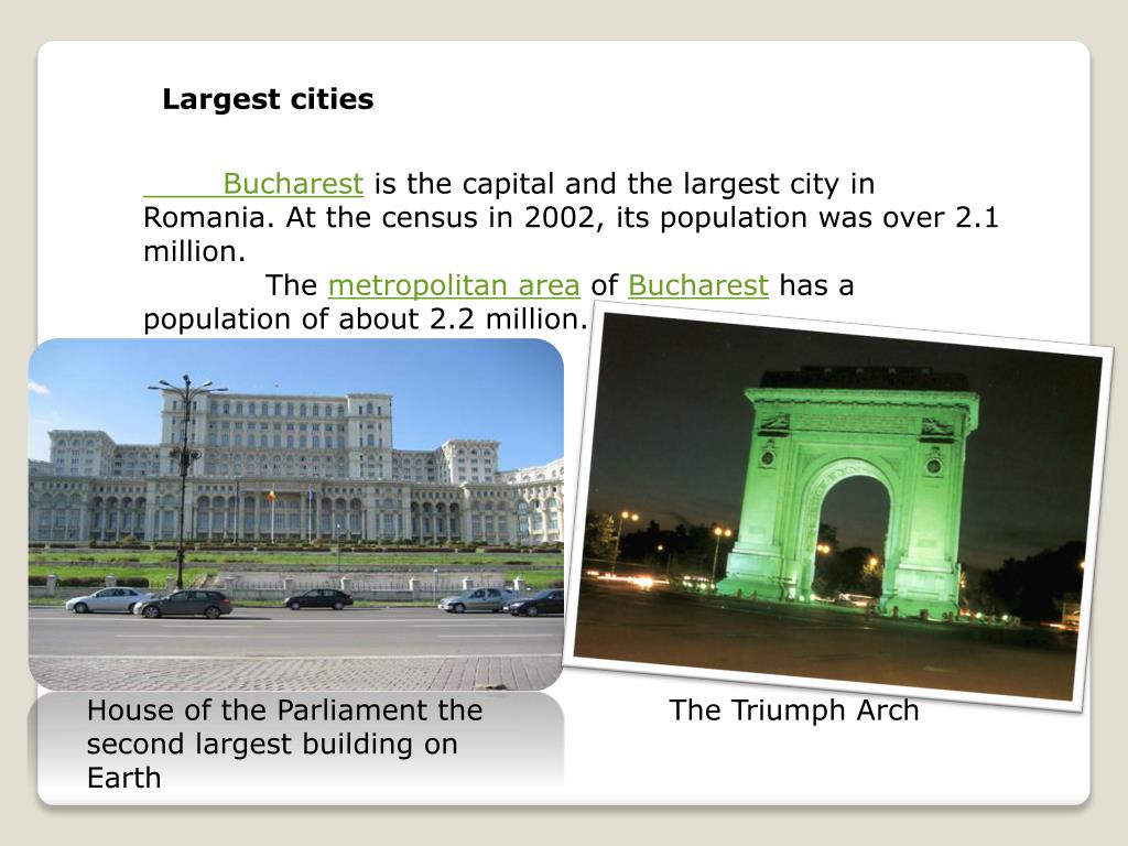 Largest cities Bucharest is the capital and the largest city in Romania. At the census in 2002, its population was over 2.1 million. The metropolitan area of Bucharest has a population of about 2.2 million. House of the Parliament the second largest building on Earth The Triumph Arch