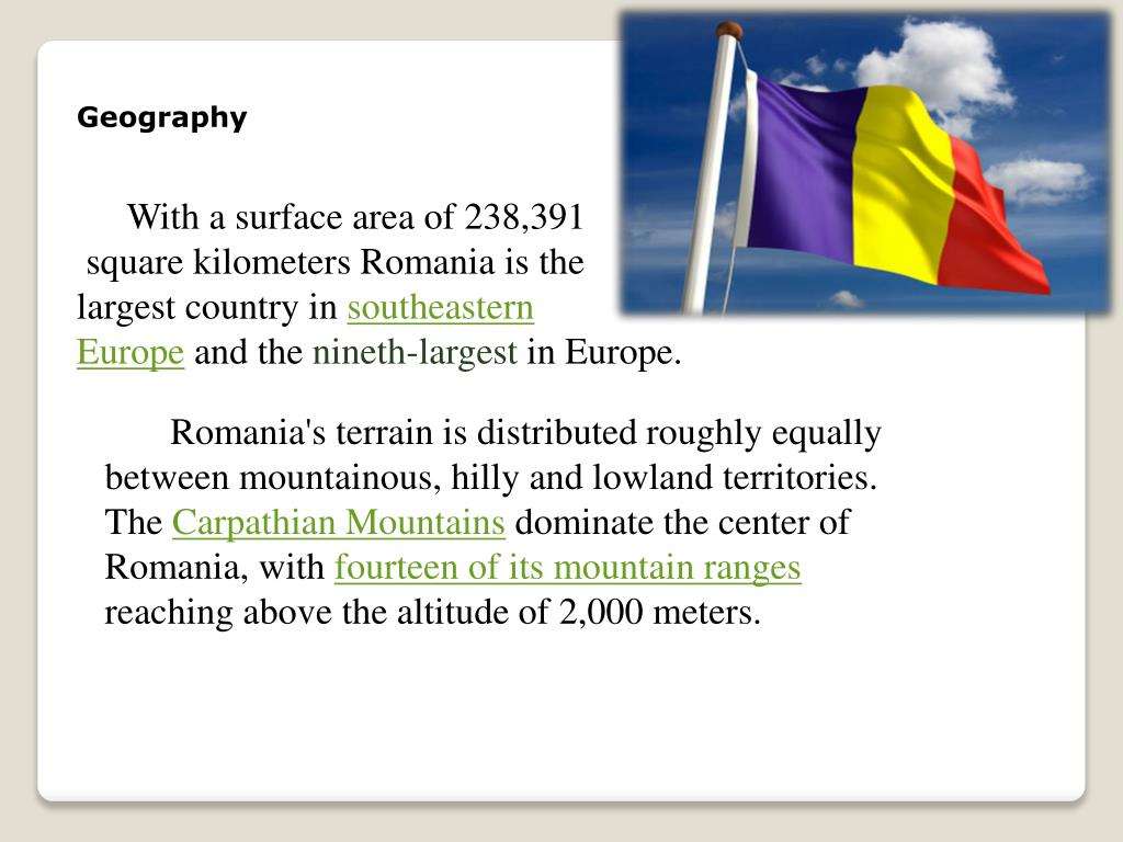 DISCOVER ROMANIA. Geography. With a surface area of 238,391 square kilometers Romania is the largest country in southeastern Europe and the nineth-largest in Europe. .