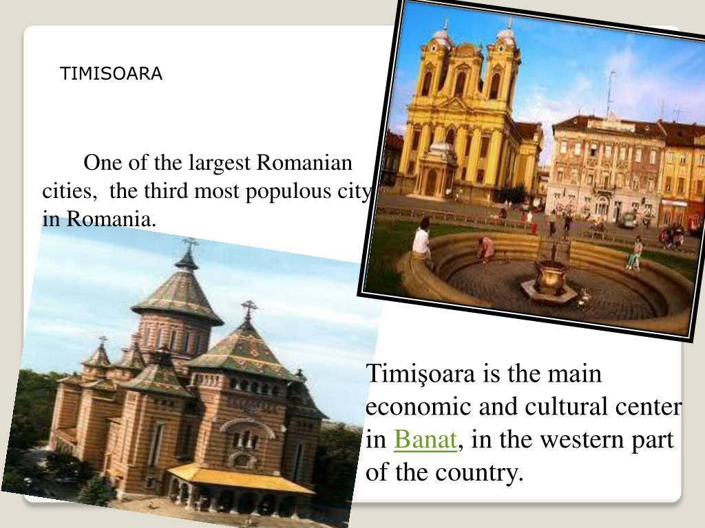 TIMISOARA One of the largest Romanian cities, the third most populous city in Romania. • Timişoara is the main economic and cultural center in Banat, in the western part of the country.