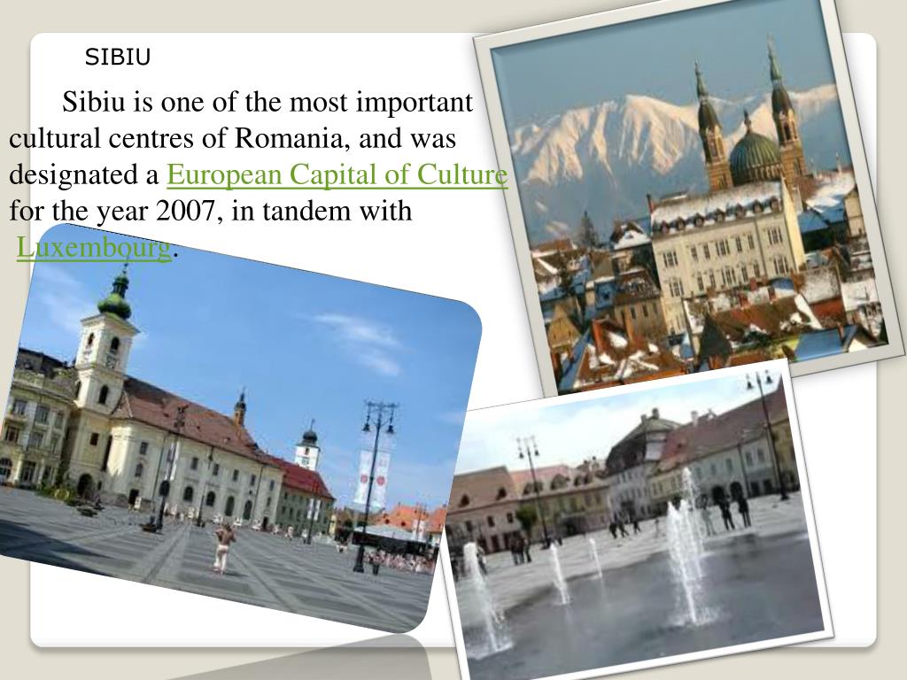 SIBIU Sibiu is one of the most important cultural centres of Romania, and was designated a European Capital of Culture for the year 2007, in tandem with Luxembourg.