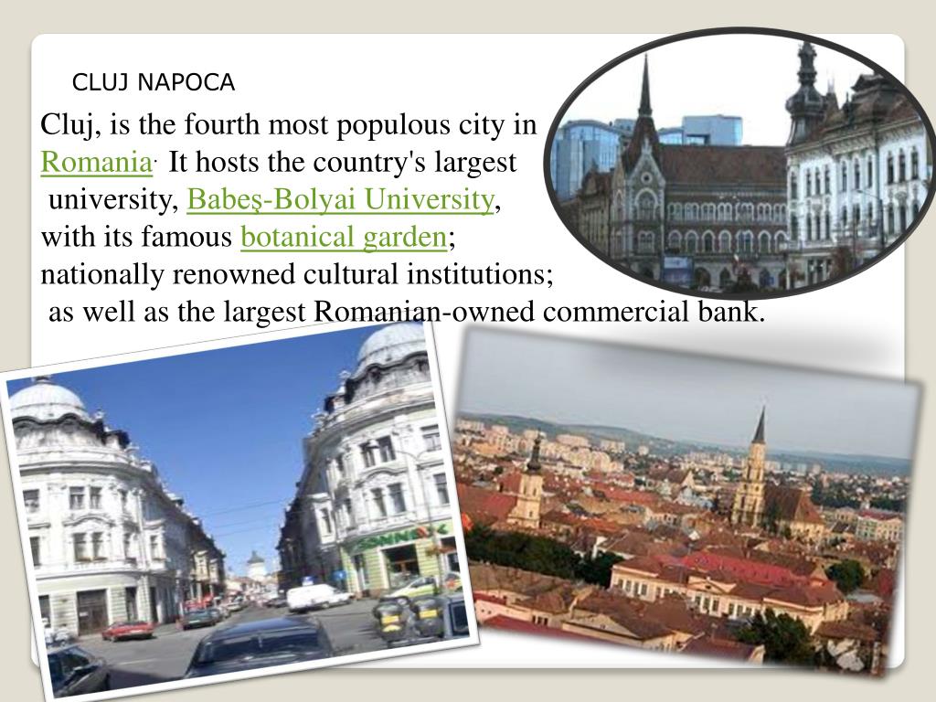 CLUJ NAPOCA Cluj, is the fourth most populous city in Romania. It hosts the country's largest university, Babeş-Bolyai University, with its famous botanical garden; nationally renowned cultural institutions; as well as the largest Romanian-owned commercial bank.