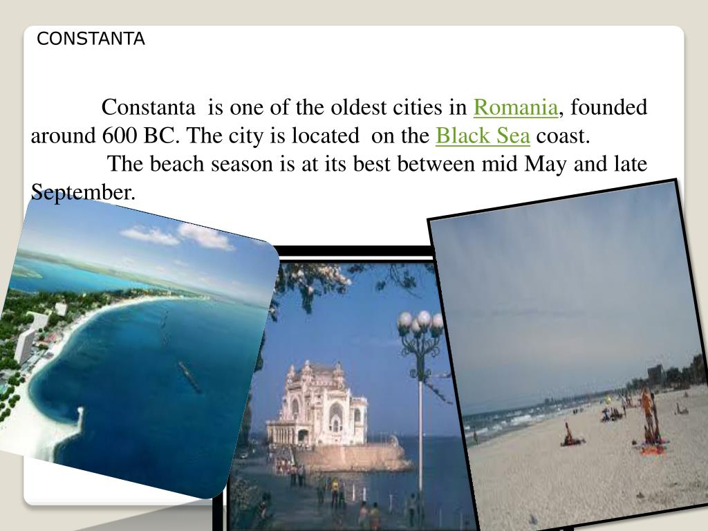 CONSTANTA Constanta is one of the oldest cities in Romania, founded around 600 BC. The city is located on the Black Sea coast. The beach season is at its best between mid May and late September.