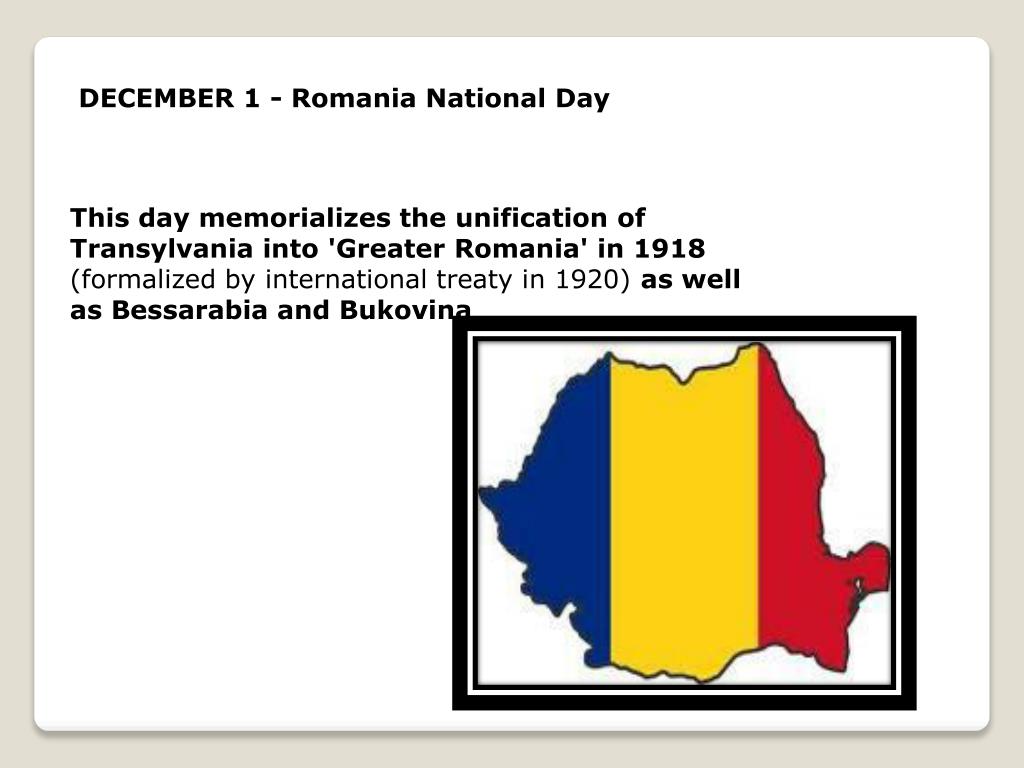DECEMBER 1 - Romania National Day This day memorializes the unification of Transylvania into 'Greater Romania' in 1918 (formalized by international treaty in 1920) as well as Bessarabia and Bukovina