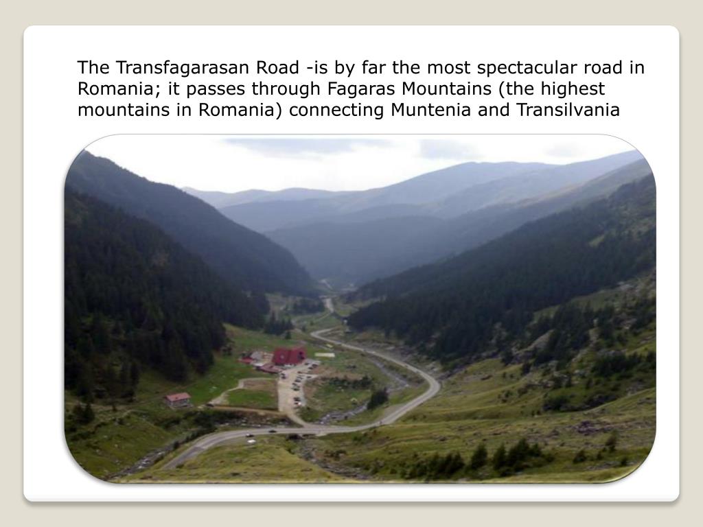 The Transfagarasan Road -is by far the most spectacular road in Romania; it passes through Fagaras Mountains (the highest mountains in Romania) connecting Muntenia and Transilvania