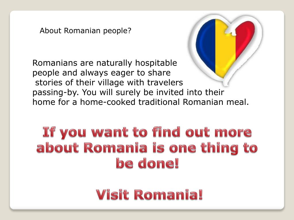 About Romanian people? Romanians are naturally hospitable people and always eager to share stories of their village with travelers passing-by. You will surely be invited into their home for a home-cooked traditional Romanian meal. If you want to find out more about Romania is one thing to be done! Visit Romania!