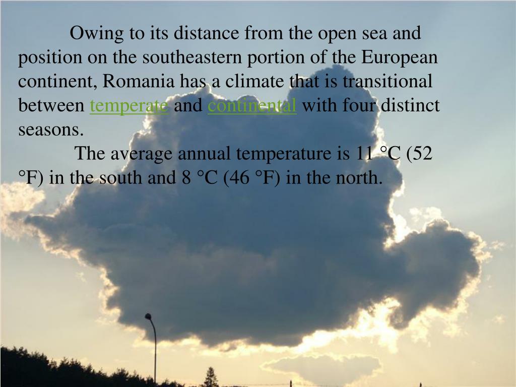 Owing to its distance from the open sea and position on the southeastern portion of the European continent, Romania has a climate that is transitional between temperate and continental with four distinct seasons. The average annual temperature is 11 °C (52 °F) in the south and 8 °C (46 °F) in the north. CLIMATE Owing to its
