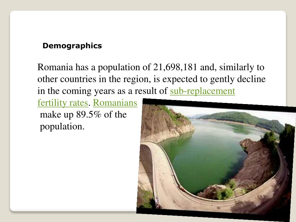 Demographics Romania has a population of 21,698,181 and, similarly to other countries in the region, is expected to gently decline in the coming years as a result of sub-replacement fertility rates. Romanians make up 89.5% of the population.