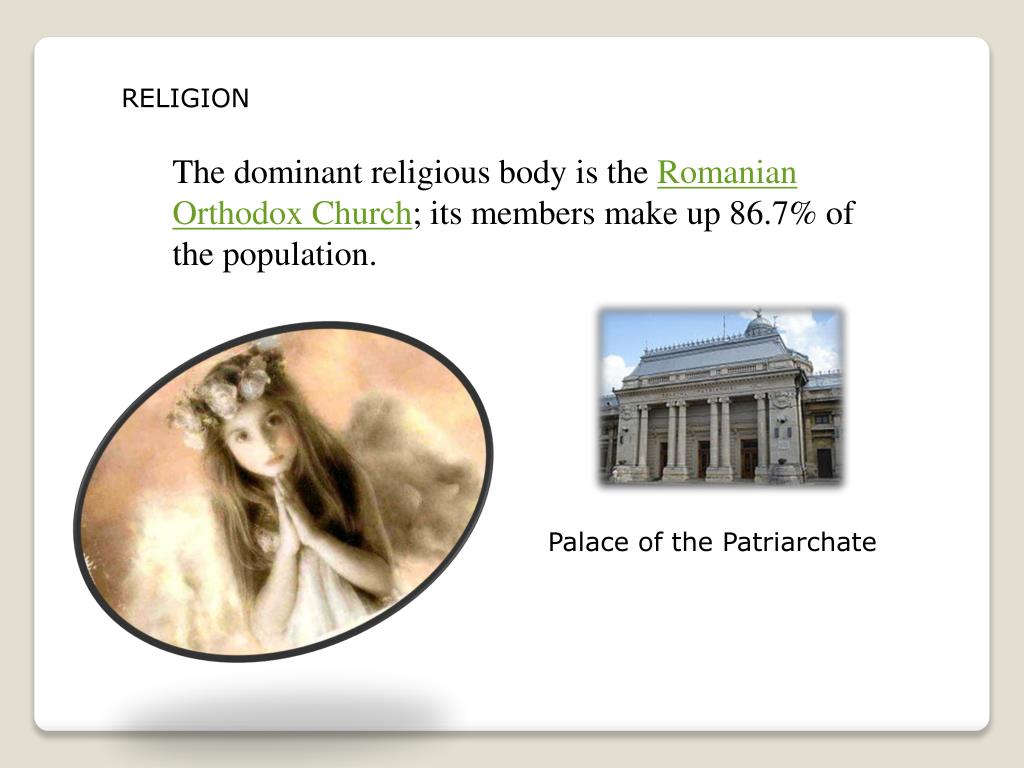 RELIGION The dominant religious body is the Romanian Orthodox Church; its members make up 86.7% of the population. Palace of the Patriarchate