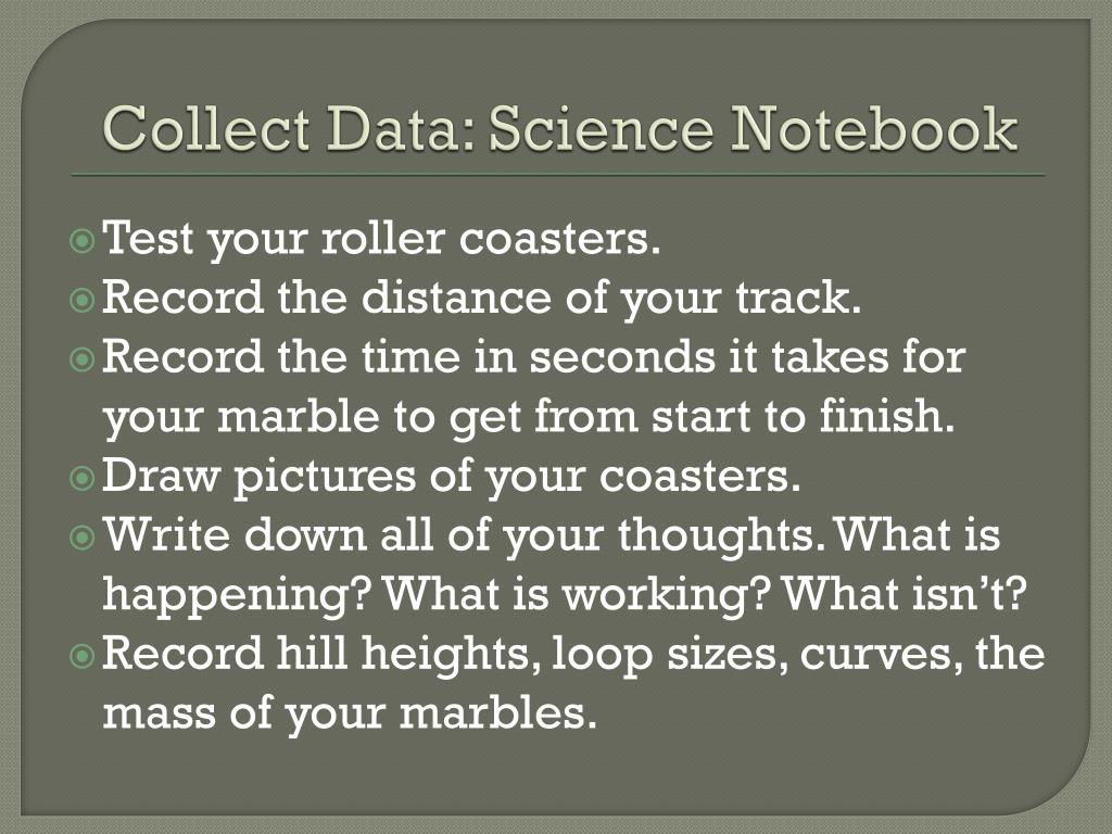 Collect Data: Science Notebook Test your roller coasters. Record the distance of your track. Record the time in seconds it takes for your marble to get from start to finish. Draw pictures of your coasters. Write down all of your thoughts. What is happening? What is working? What isn’t? Record hill heights, loop sizes, curves, the mass of your marbles.