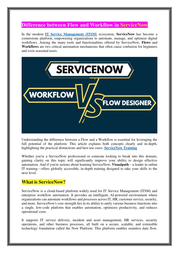 Difference between Flow and Workflow in ServiceNow In the modern IT Service Management (ITSM) ecosystem, ServiceNow has become a cornerstone platform, empowering organizations to automate, manage, and optimize digital workflows. Among the many tools and functionalities offered by ServiceNow, Flows and Workflows are two critical automation mechanisms that often cause confusion for beginners and even seasoned users. Understanding the difference between a Flow and a Workflow is essential for leveraging the full potential of the platform. This article explains both concepts clearly and in-depth, highlighting the practical distinctions and best use cases. ServiceNow Training Whether you're a ServiceNow professional or someone looking to break into this domain, gaining clarity on this topic will significantly improve your ability to design effective automation. And if you're serious about learning ServiceNow, Visualpath—a leader in online IT training—offers globally accessible, in-depth training designed to take your skills to the next level. What is ServiceNow? ServiceNow is a cloud-based platform widely used for IT Service Management (ITSM) and enterprise workflow automation. It provides an intelligent, AI-powered environment where organizations can automate workflows and processes across IT, HR, customer service, security, and more. ServiceNow's core strength lies in its ability to unify various business functions into a single, low-code platform that enables automation, optimizes productivity, and reduces operational costs. It supports IT service delivery, incident and asset management, HR services, security operations, and other business processes, all built on a secure, scalable, and extensible technology foundation called the Now Platform. This platform enables seamless data flow,
