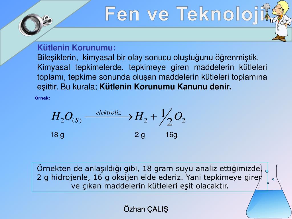 Kütlenin Korunumu: Bileşiklerin, kimyasal bir olay sonucu oluştuğunu öğrenmiştik. Kimyasal tepkimelerde, tepkimeye giren maddelerin kütleleri toplamı, tepkime sonunda oluşan maddelerin kütleleri toplamına eşittir. Bu kurala; Kütlenin Korunumu Kanunu denir. Örnek: 18 g 2 g 16g Örnekten de anlaşıldığı gibi, 18 gram suyu analiz ettiğimizde, 2 g hidrojenle, 16 g oksijen elde ederiz. Yani tepkimeye giren ve çıkan maddelerin kütleleri eşit olacaktır.