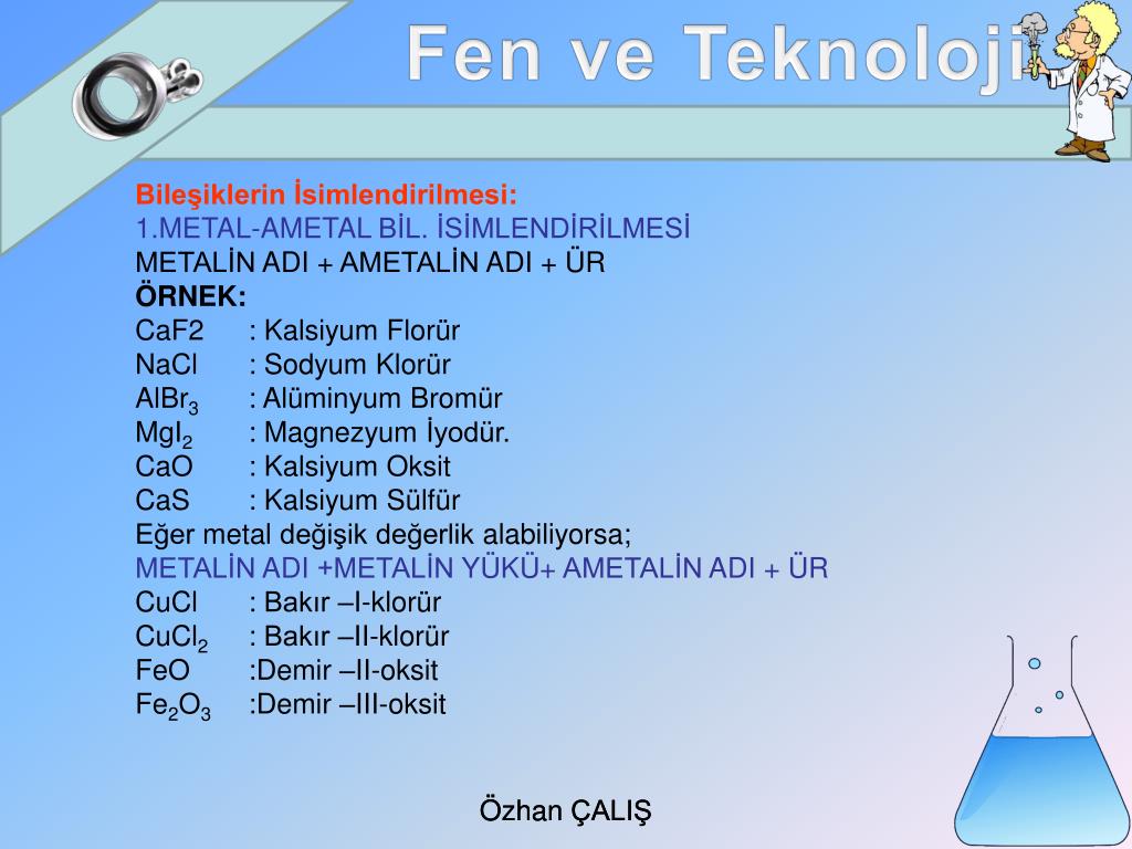 Bileşiklerin İsimlendirilmesi: 1.METAL-AMETAL BİL. İSİMLENDİRİLMESİ METALİN ADI + AMETALİN ADI + ÜR ÖRNEK: CaF2 : Kalsiyum Florür NaCl : Sodyum Klorür AlBr3 : Alüminyum Bromür MgI2 : Magnezyum İyodür. CaO : Kalsiyum Oksit CaS : Kalsiyum Sülfür Eğer metal değişik değerlik alabiliyorsa; METALİN ADI +METALİN YÜKÜ+ AMETALİN ADI + ÜR CuCl : Bakır –I-klorür CuCl2 : Bakır –II-klorür FeO :Demir –II-oksit Fe2O3 :Demir –III-oksit