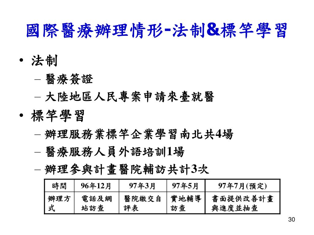 衛生署參與國際醫療之角色 • 本於醫療之專業與使命 • 提升醫療品質,維護病人安全 • 發揚人道醫療的精神 • 輔導醫療產業提供優質醫療服務,帶動醫療產業持續進步 • 促進跨部會合作機制,共同行銷臺灣優質醫療服務品質