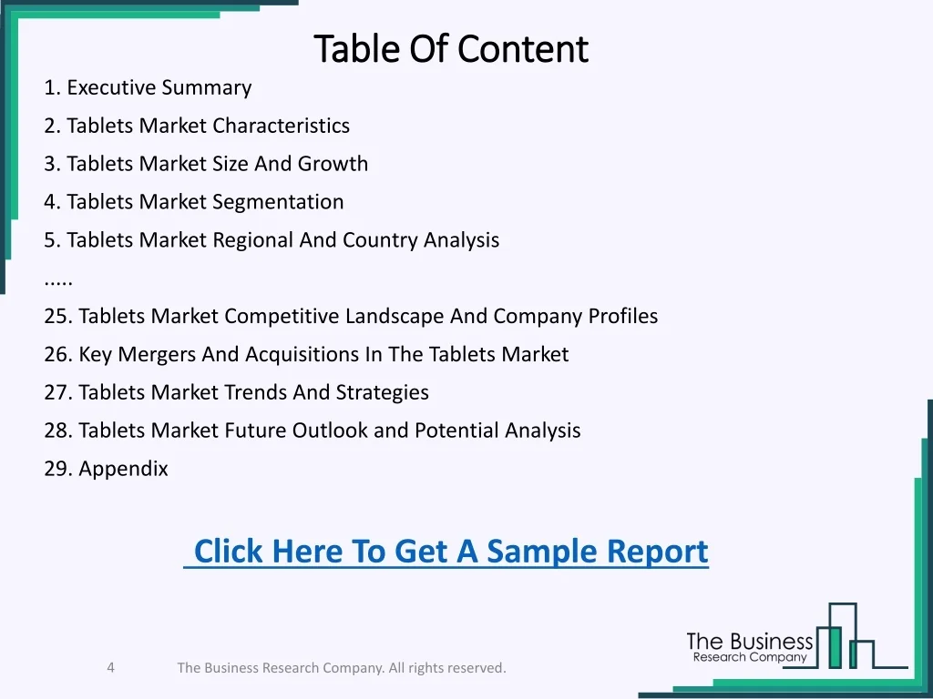 Table Of Content 1. Executive Summary 2. Tablets Market Characteristics 3. Tablets Market Size And Growth 4. Tablets Market Segmentation 5. Tablets Market Regional And Country Analysis ..... 25. Tablets Market Competitive Landscape And Company Profiles 26. Key Mergers And Acquisitions In The Tablets Market 27. Tablets Market Trends And Strategies 28. Tablets Market Future Outlook and Potential Analysis 29. Appendix Click Here To Get A Sample Report The Business Research Company. All rights reserved.