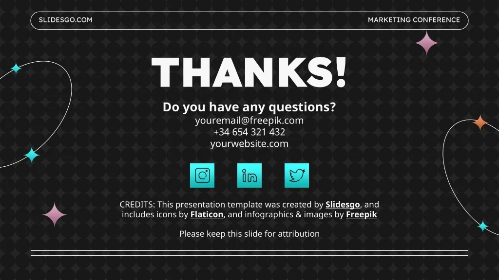 SLIDESGO.COM MARKETING CONFERENCE THANKS! Do you have any questions? youremail@freepik.com +34 654 321 432 yourwebsite.com Please keep this slide for attribution