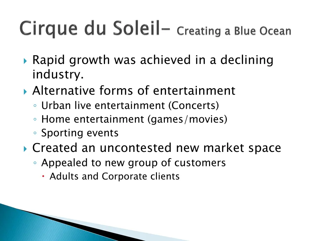 Rapid growth was achieved in a declining industry. Alternative forms of entertainment ◦ Urban live entertainment (Concerts) ◦ Home entertainment (games/movies) ◦ Sporting events Created an uncontested new market space ◦ Appealed to new group of customers Adults and Corporate clients