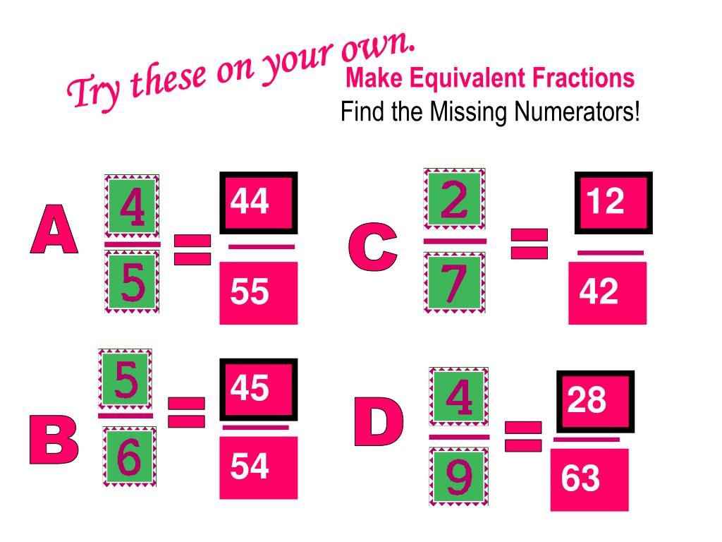 Make Equivalent FractionsFind the Missing Numerators! Try these on your own. 44 12 A C = = 55 42 45 28 = D B = 54 63
