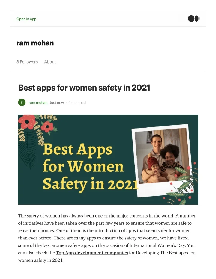 Open in app Open in app ram mohan 3 Followers About Best apps for women safety in 2021 ram mohan Just now · 4 min read The safety of women has always been one of the major concerns in the world. A number of initiatives have been taken over the past few years to ensure that women are safe to leave their homes. One of them is the introduction of apps that seem safer for women than ever before. There are many apps to ensure the safety of women, we have listed some of the best women safety apps on the occasion of International Women’s Day. You can also check the Top App development companies for Developing The Best apps for women safety in 2021