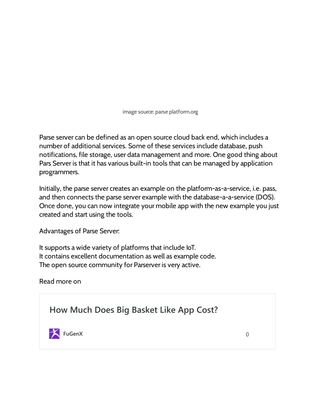 image source: parse platform.org Parse server can be defined as an open source cloud back end, which includes a number of additional services. Some of these services include database, push notifications, file storage, user data management and more. One good thing about Pars Server is that it has various built-in tools that can be managed by application programmers. Initially, the parse server creates an example on the platform-as-a-service, i.e. pass, and then connects the parse server example with the database-a-a-service (DOS). Once done, you can now integrate your mobile app with the new example you just created and start using the tools. Advantages of Parse Server: It supports a wide variety of platforms that include IoT. It contains excellent documentation as well as example code. The open source community for Parserver is very active. Read more on How Much Does Big Basket Like App Cost? FuGenX 0