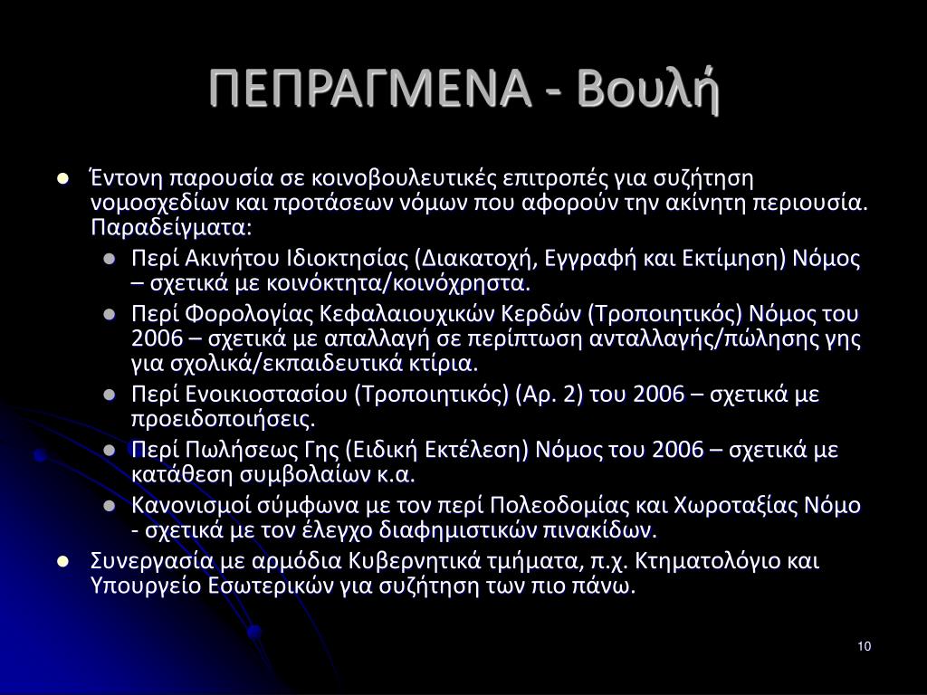 ΠΕΠΡΑΓΜΕΝΑ - Βουλή • Έντονη παρουσία σε κοινοβουλευτικές επιτροπές για συζήτηση νομοσχεδίων και προτάσεων νόμων που αφορούν την ακίνητη περιουσία. Παραδείγματα: • Περί Ακινήτου Ιδιοκτησίας (Διακατοχή, Εγγραφή και Εκτίμηση) Νόμος – σχετικά με κοινόκτητα/κοινόχρηστα. • Περί Φορολογίας Κεφαλαιουχικών Κερδών (Τροποιητικός) Νόμος του 2006 – σχετικά με απαλλαγή σε περίπτωση ανταλλαγής/πώλησης γης για σχολικά/εκπαιδευτικά κτίρια. • Περί Ενοικιοστασίου (Τροποιητικός) (Αρ. 2) του 2006 – σχετικά με προειδοποιήσεις. • Περί Πωλήσεως Γης (Ειδική Εκτέλεση) Νόμος του 2006 – σχετικά με κατάθεση συμβολαίων κ.α. • Κανονισμοί σύμφωνα με τον περί Πολεοδομίας και Χωροταξίας Νόμο - σχετικά με τον έλεγχο διαφημιστικών πινακίδων. • Συνεργασία με αρμόδια Κυβερνητικά τμήματα, π.χ. Κτηματολόγιο και Υπουργείο Εσωτερικών για συζήτηση των πιο πάνω.