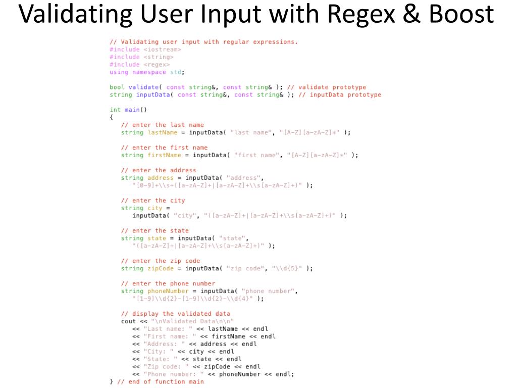 // Demonstrating regular expressions. #include <iostream> #include <string> #include <regex> using namespace std; // allows use of features in both std and std::tr1 int main() { // create a regular expression regex expression( "J.*\\d[0-35-9]-\\d\\d-\\d\\d" ); // create a string to be tested string string1 = "Jane's Birthday is 05-12-75\n" "Dave's Birthday is 11-04-68\n" "John's Birthday is 04-28-73\n" "Joe's Birthday is 12-17-77”; // create a std::tr1::smatch object to hold the search results smatch match; // match regular expression to string and print out all matches while ( regex_search( string1, match, expression, regex_constants::match_not_eol ) ) { cout << match.str() << endl; // print the matching string // remove the matched substring from the string string1 = match.suffix(); } // end while } // end of function main