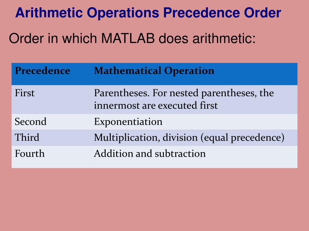 Arithmetic Operations Precedence Rules The MATLAB precedence order is The same as most calculators. The same as doing arithmetic by hand. For multiple operations of same precedence, MATLAB goes left to right. You can change order by using parentheses.