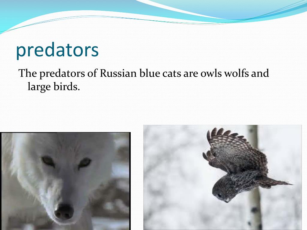 predators The predators of Russian blue cats are owls wolfs and large birds.