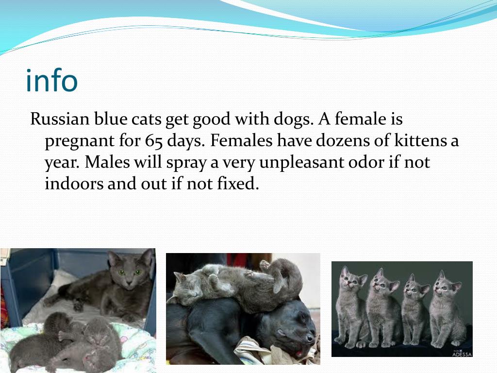 info Russian blue cats get good with dogs. A female is pregnant for 65 days. Females have dozens of kittens a year. Males will spray a very unpleasant odor if not indoors and out if not fixed.