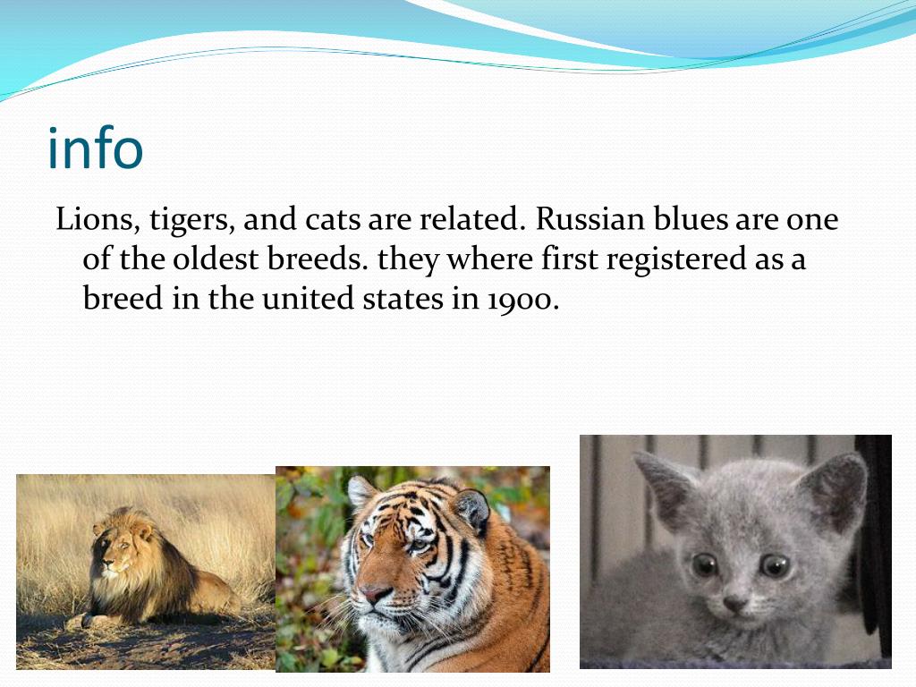 info Lions, tigers, and cats are related. Russian blues are one of the oldest breeds. they where first registered as a breed in the united states in 1900.