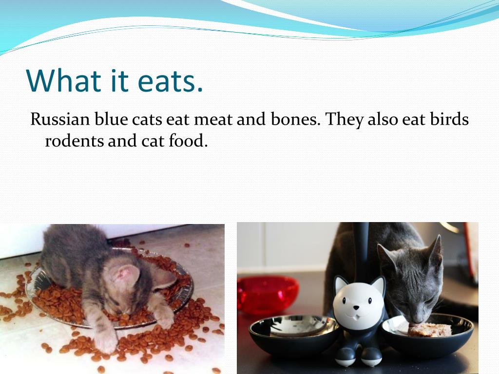 What it eats. Russian blue cats eat meat and bones. They also eat birds rodents and cat food.