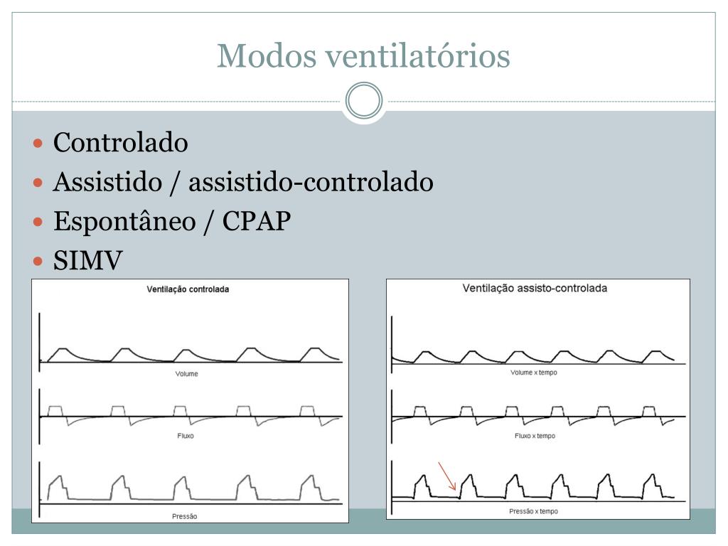 Modos ventilatórios Controlado Assistido / assistido-controlado Espontâneo / CPAP SIMV