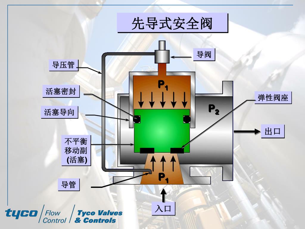 先导式安全阀 导阀 导压管 P1 活塞密封 弹性阀座 P2 活塞导向 出口 不平衡 移动副 (活塞) P1 导管 入口
