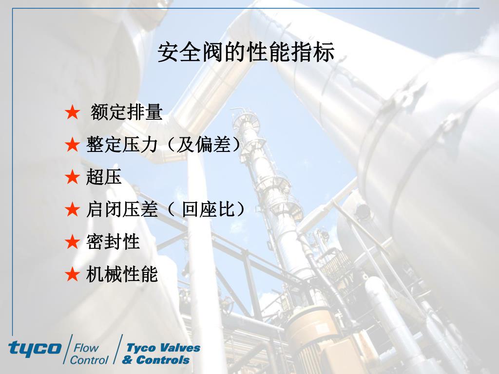 安全阀的性能指标 ★ 额定排量 ★ 整定压力(及偏差) ★ 超压 ★ 启闭压差( 回座比) ★ 密封性 ★ 机械性能