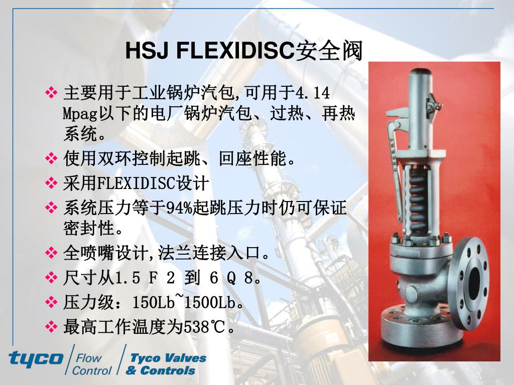 HSJFLEXIDISC安全阀 • 主要用于工业锅炉汽包,可用于4.14 Mpag以下的电厂锅炉汽包、过热、再热系统。 • 使用双环控制起跳、回座性能。 • 采用FLEXIDISC设计 • 系统压力等于94%起跳压力时仍可保证密封性。 • 全喷嘴设计,法兰连接入口。 • 尺寸从1.5 F 2 到 6 Q 8。 • 压力级:150Lb~1500Lb。 • 最高工作温度为538℃。