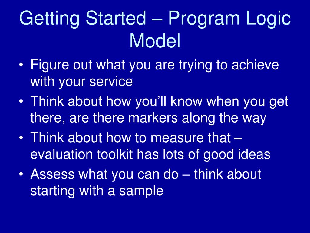 Getting Started – Program Logic Model • Figure out what you are trying to achieve with your service • Think about how you’ll know when you get there, are there markers along the way • Think about how to measure that – evaluation toolkit has lots of good ideas • Assess what you can do – think about starting with a sample