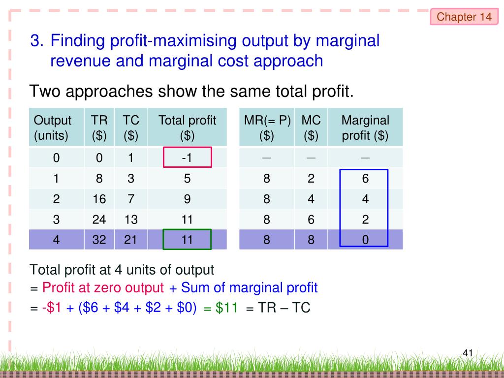 3. Finding profit-maximising output by marginal revenue and marginal cost approach Two approaches show the same total profit. Total profit at 4 units of output = Profit at zero output + Sum of marginal profit = -$1 + ($6 + $4 + $2 + $0) = $11 = TR – TC