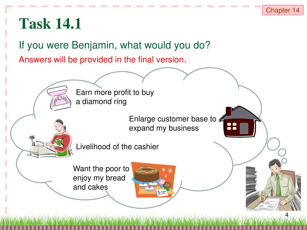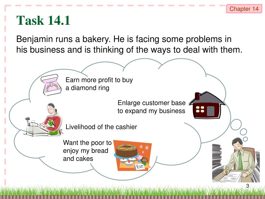 Task 14.1 Benjamin runs a bakery. He is facing some problems in his business and is thinking of the ways to deal with them. Earn more profit to buy a diamond ring Enlarge customer base to expand my business Livelihood of the cashier Want the poor to enjoy my bread and cakes