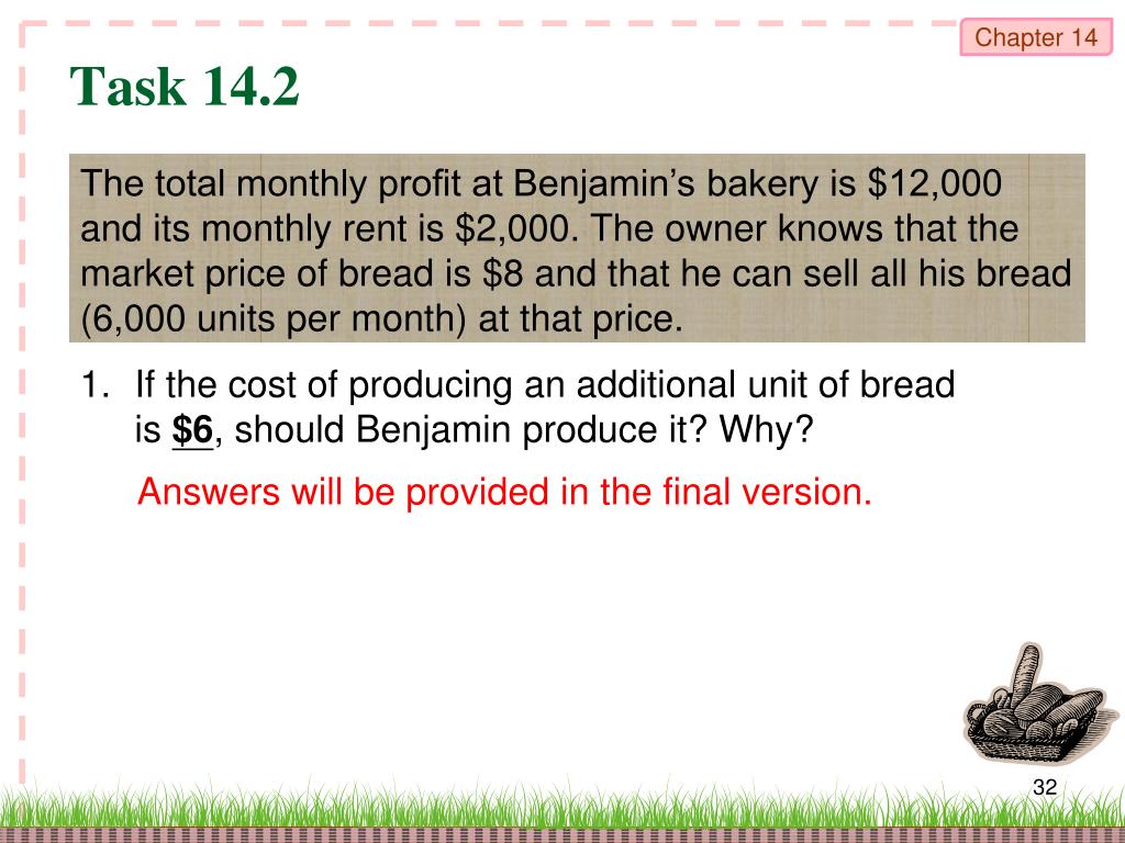 Task 14.2 The total monthly profit at Benjamin’s bakery is $12,000 and its monthly rent is $2,000. The owner knows that the market price of bread is $8 and that he can sell all his bread (6,000 units per month) at that price. 1. If the cost of producing an additional unit of bread is $6, should Benjamin produce it? Why? Answers will be provided in the final version.