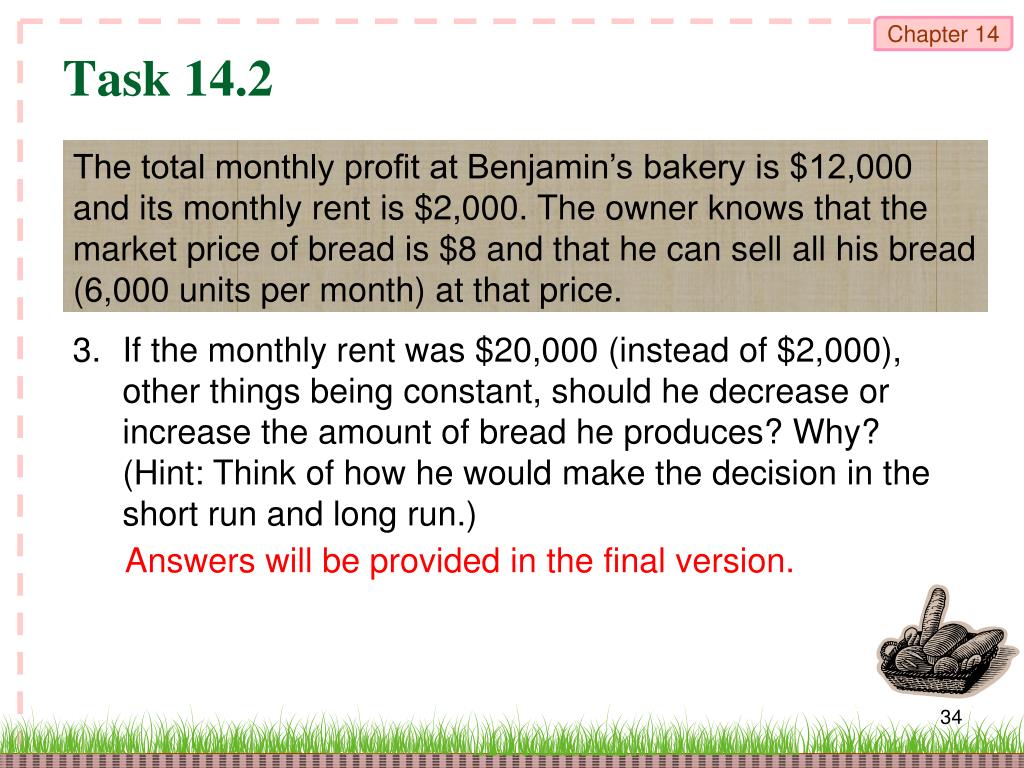 Task 14.2 The total monthly profit at Benjamin’s bakery is $12,000 and its monthly rent is $2,000. The owner knows that the market price of bread is $8 and that he can sell all his bread (6,000 units per month) at that price. 3. If the monthly rent was $20,000 (instead of $2,000), other things being constant, should he decrease or increase the amount of bread he produces? Why?(Hint: Think of how he would make the decision in the short run and long run.) Answers will be provided in the final version.