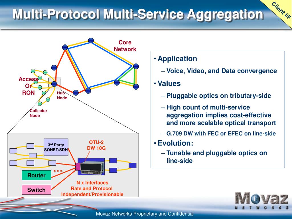 Client I/F Core Network Access Or RON Hub Node Collector Node OTU-2 DW 10G 3rd Party SONET/SDH OADM … Router N x Interfaces Rate and Protocol Independent/Provisionable Switch Multi-Protocol Multi-Service Aggregation • Application • Voice, Video, and Data convergence • Values • Pluggable optics on tributary-side • High count of multi-service aggregation implies cost-effective and more scalable optical transport • G.709 DW with FEC or EFEC on line-side • Evolution: • Tunable and pluggable optics on line-side