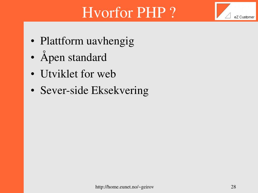 Hvorfor PHP ? • Plattform uavhengig • Åpen standard • Utviklet for web • Sever-side Eksekvering http://home.eunet.no/~geirov