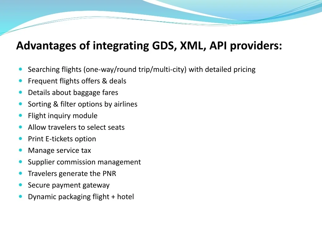 Advantages of integrating GDS, XML, API providers: • Searching flights (one-way/round trip/multi-city) with detailed pricing • Frequent flights offers & deals • Details about baggage fares • Sorting & filter options by airlines • Flight inquiry module • Allow travelers to select seats • Print E-tickets option • Manage service tax • Supplier commission management • Travelers generate the PNR • Secure payment gateway • Dynamic packaging flight + hotel