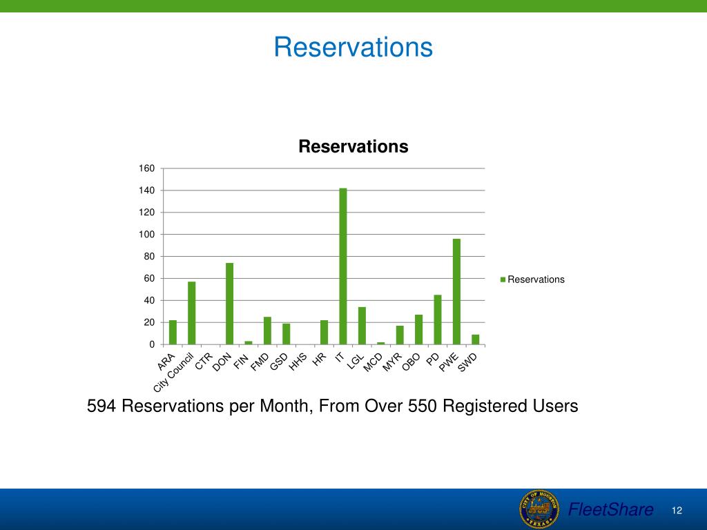 What is FleetShare • City of Houston Fleet Share is a revolutionary motor pool system for City government employees. • This state-of-the art scheduling and access system allows employees to make and manage reservations online, and its wireless technology permits drivers to gain access to vehicles without the need to locate keys, contact other personnel for assistance, or enquire as to the current whereabouts of a particular vehicle. • Launched July 2012 • 100 Enrolled Drivers • 25 Vehicles