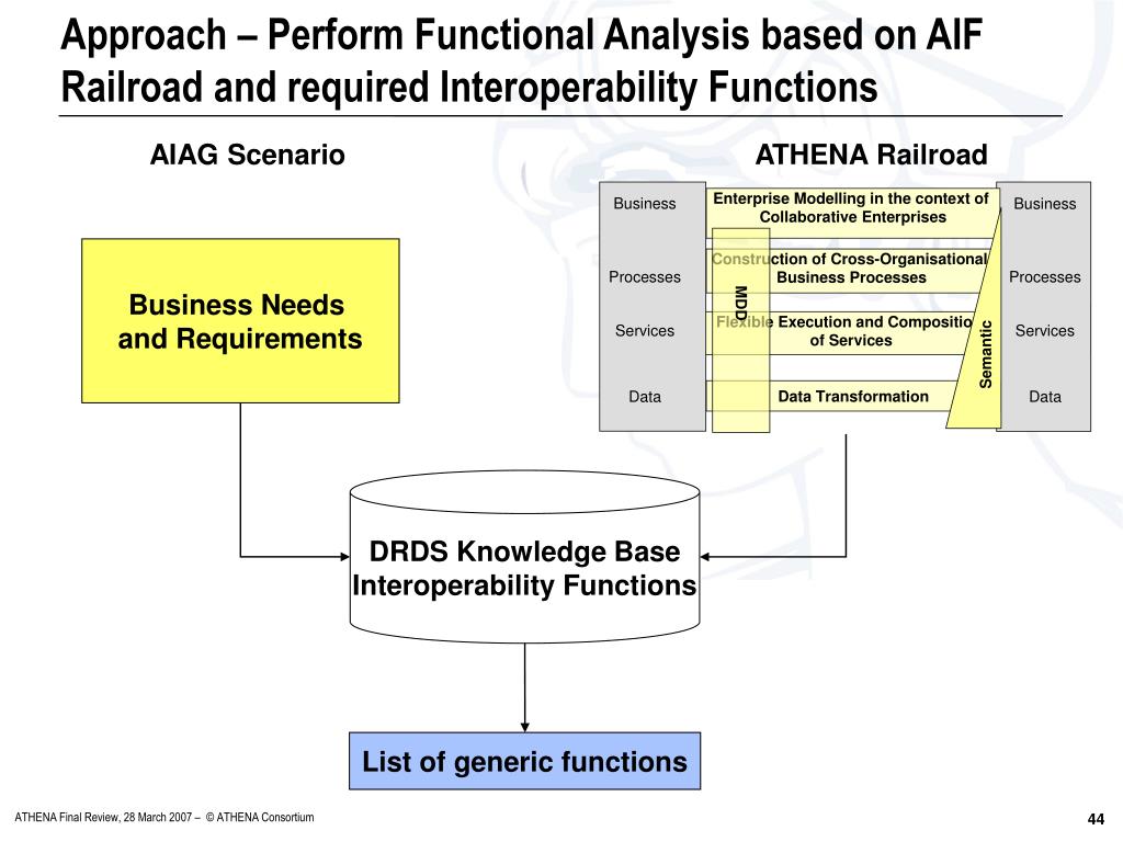 Approach – Perform Functional Analysis based on AIF Railroad and required Interoperability Functions AIAG Scenario ATHENA Railroad Business Needs and Requirements DRDS Knowledge Base Interoperability Functions List of generic functions