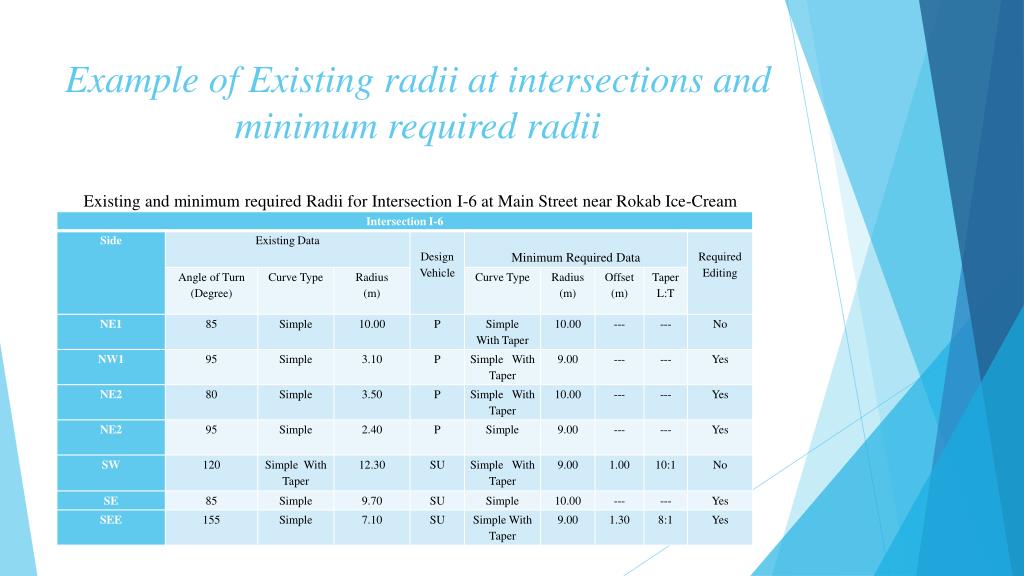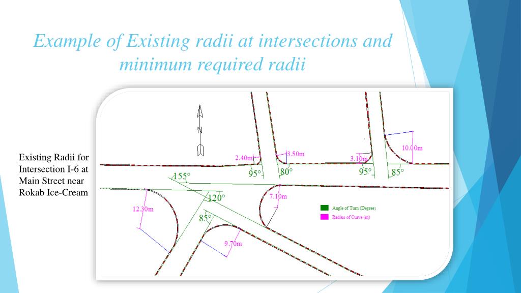 Example of Existing radii at intersections and minimum required radii Existing and minimum required Radii for Intersection I-6 at Main Street near Rokab Ice-Cream