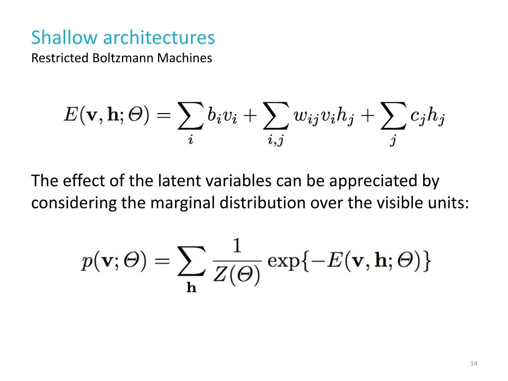 Shallow architectures Restricted Boltzmann Machines The effect of the latent variables can be appreciated by considering the marginal distribution over the visible units: