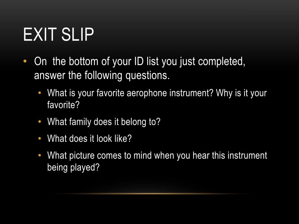 Exit Slip • On the bottom of your ID list you just completed, answer the following questions. • What is your favorite aerophone instrument? Why is it your favorite? • What family does it belong to? • What does it look like? • What picture comes to mind when you hear this instrument being played?