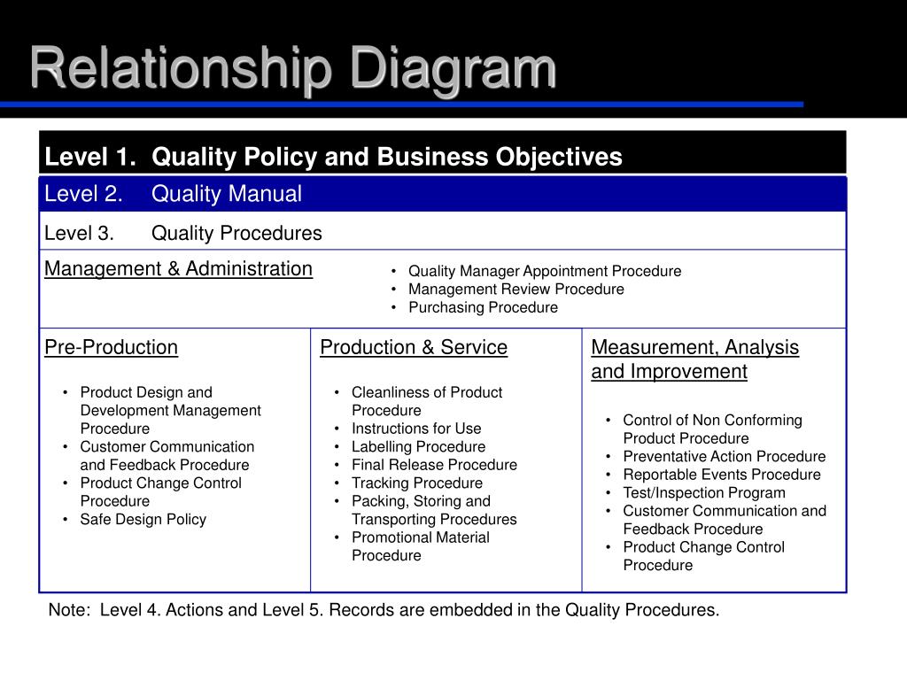 Relationship Diagram Level 1. Quality Policy and Business Objectives Level 2. Quality Manual Level 3. Quality Procedures Management & Administration • Quality Manager Appointment Procedure • Management Review Procedure • Purchasing Procedure Pre-Production Production & Service Measurement, Analysis and Improvement • Product Design and Development Management Procedure • Customer Communication and Feedback Procedure • Product Change Control Procedure • Safe Design Policy • Cleanliness of Product Procedure • Instructions for Use • Labelling Procedure • Final Release Procedure • Tracking Procedure • Packing, Storing and Transporting Procedures • Promotional Material Procedure • Control of Non Conforming Product Procedure • Preventative Action Procedure • Reportable Events Procedure • Test/Inspection Program • Customer Communication and Feedback Procedure • Product Change Control Procedure Note: Level 4. Actions and Level 5. Records are embedded in the Quality Procedures.
